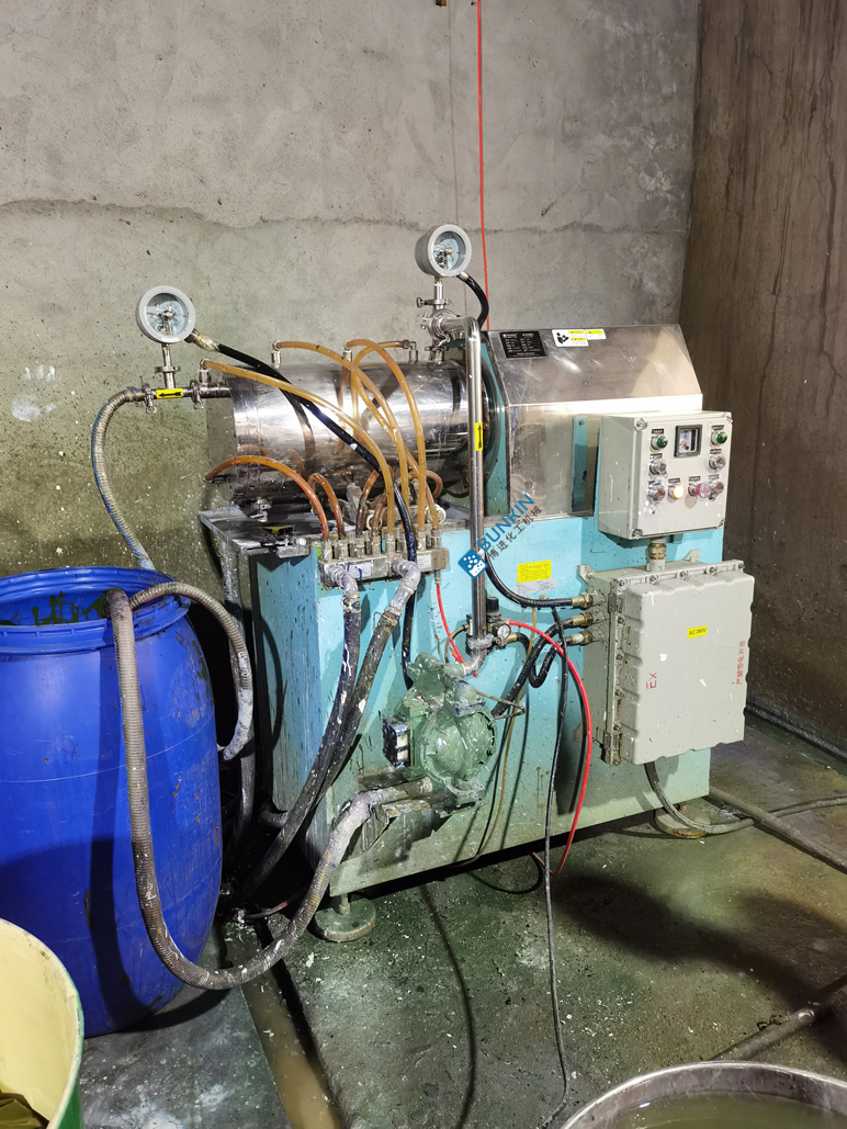 江蘇XXX新材料有限公司購(gòu)買(mǎi)的臥式砂磨機(jī)、袋式過(guò)濾器等設(shè)備使用現(xiàn)場(chǎng)。