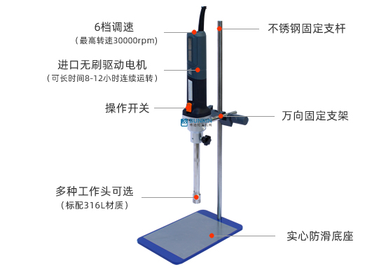 高剪切分散乳化機集靈巧、方便于一身。可手持操作。選用德國原裝無刷大功率馬達,無刷電機,運行更穩(wěn)定,噪聲更小,可處理更大范圍粘度物料。轉(zhuǎn)速可達30000rpm,可長時間8-12小時連續(xù)運轉(zhuǎn),多種工作頭可供選擇,輕松滿足多種高要求分散、乳化、均質(zhì)的實驗要求 。