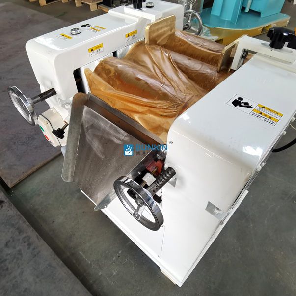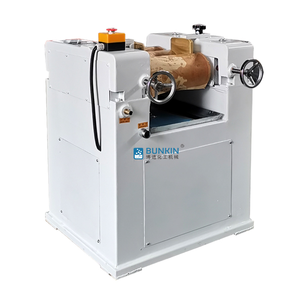 三輥研磨機(jī)由三個(gè)輥筒組成,裝在一個(gè)機(jī)架上,由電動機(jī)直接帶動。一般輥筒間的轉(zhuǎn)動方向不同,前輥向前轉(zhuǎn)動,中輥向后轉(zhuǎn)動。輥?zhàn)愚D(zhuǎn)速前輥快、后輥慢。中間輥固定,前后兩輥裝在滑道上,有彈簧裝置,用手輪調(diào)節(jié)前后輥與中輥的距離。物料由后輥與中輥之間進(jìn)入,受到輥筒的擠壓,產(chǎn)品顆粒變細(xì),然后由快輥帶出,快輥末端裝有刮刀,使物料與輥筒分離,落入收集桶內(nèi)。