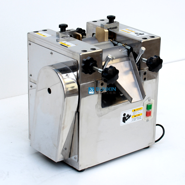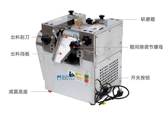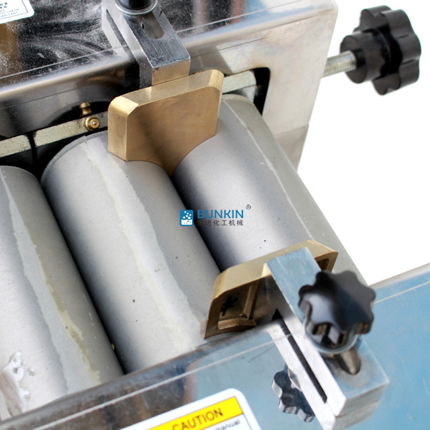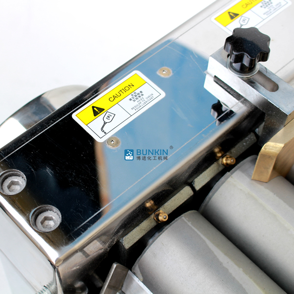 實驗室三輥研磨機(jī)由三個輥筒組成,裝在一個機(jī)架上,由電動機(jī)直接帶動。一般輥筒間的轉(zhuǎn)動方向不同,前輥向前轉(zhuǎn)動,中輥向后轉(zhuǎn)動。輥子轉(zhuǎn)速前輥快、后輥慢。中間輥固定,前后兩輥裝在滑道上,有彈簧裝置,用手輪調(diào)節(jié)前后輥與中輥的距離。物料由后輥與中輥之間進(jìn)入,受到輥筒的擠壓,產(chǎn)品顆粒變細(xì),然后由快輥帶出,快輥末端裝有刮刀,使物料與輥筒分離,落入收集桶內(nèi)。