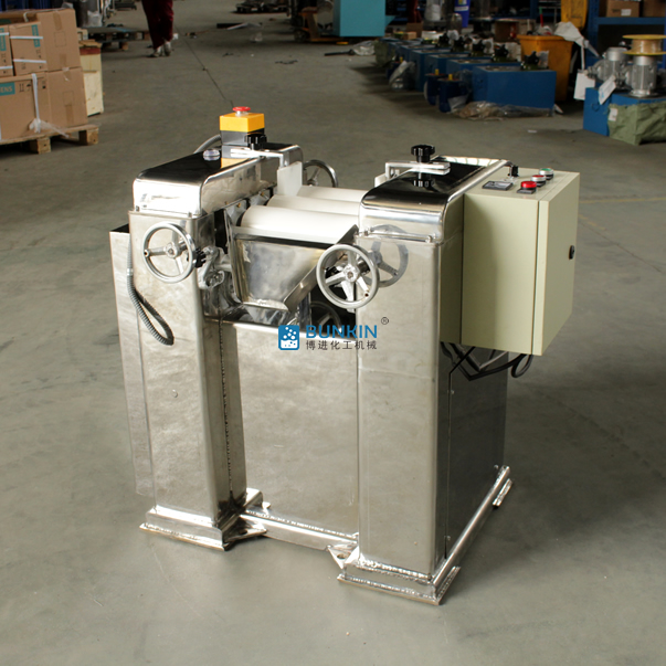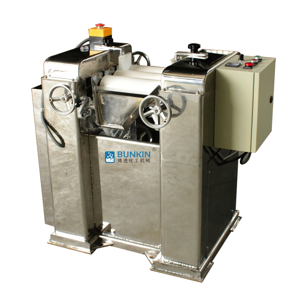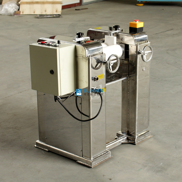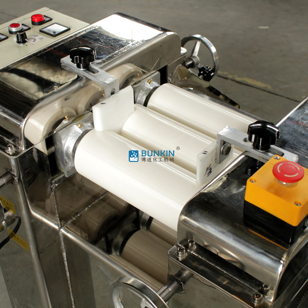 三輥研磨機(jī)由三個(gè)輥筒組成,裝在一個(gè)機(jī)架上,由電動機(jī)直接帶動。一般輥筒間的轉(zhuǎn)動方向不同,前輥向前轉(zhuǎn)動,中輥向后轉(zhuǎn)動。輥?zhàn)愚D(zhuǎn)速前輥快、后輥慢。中間輥固定,前后兩輥裝在滑道上,有彈簧裝置,用手輪調(diào)節(jié)前后輥與中輥的距離。物料由后輥與中輥之間進(jìn)入,受到輥筒的擠壓,產(chǎn)品顆粒變細(xì),然后由快輥帶出,快輥末端裝有刮刀,使物料與輥筒分離,落入收集桶內(nèi)。