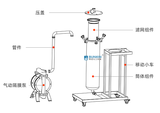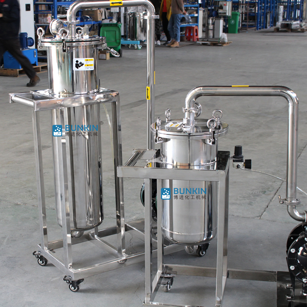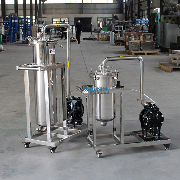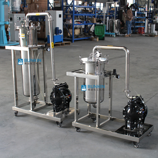 過濾小車包括了一個不銹鋼袋式過濾器、氣動隔膜泵、氣源二聯(lián)件、單氣控閥,裝置在不銹鋼手推車上。氣動隔膜泵將物料從拉缸或者罐體吸入至過濾器外殼的旁側(cè)入口管流入濾袋,過濾掉雜質(zhì)后的物料泵送至灌裝機進行灌裝或者進入儲罐儲存。袋式過濾器是一種壓力式過濾裝置,主要有過濾筒體、過濾筒蓋和快開機構(gòu)、不銹鋼濾袋加強網(wǎng)等主要部件組成,濾液由過濾機外殼的旁側(cè)入口管流入濾袋,濾袋本身是裝置在加強網(wǎng)籃內(nèi),液體滲透過所需要細度等級的濾袋即能獲得合格的濾液,雜質(zhì)顆粒被濾袋攔截。不銹鋼移動小車,帶萬向腳輪,移動方便。無電火花產(chǎn)生,符合防爆要求。