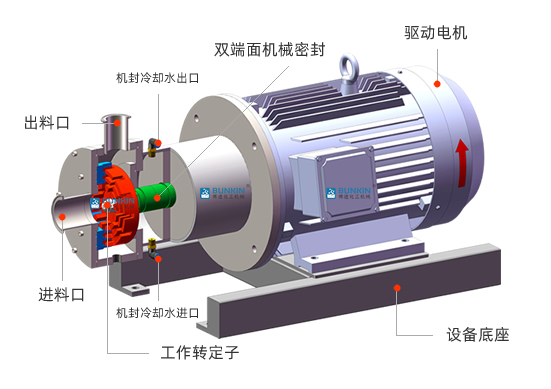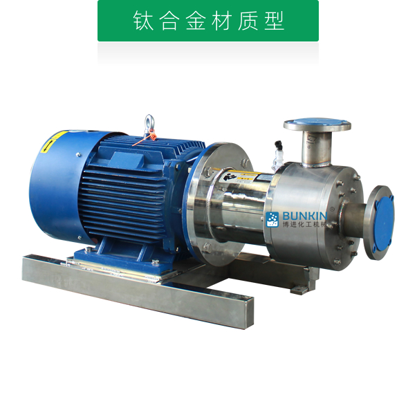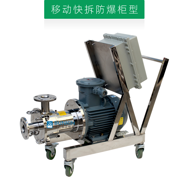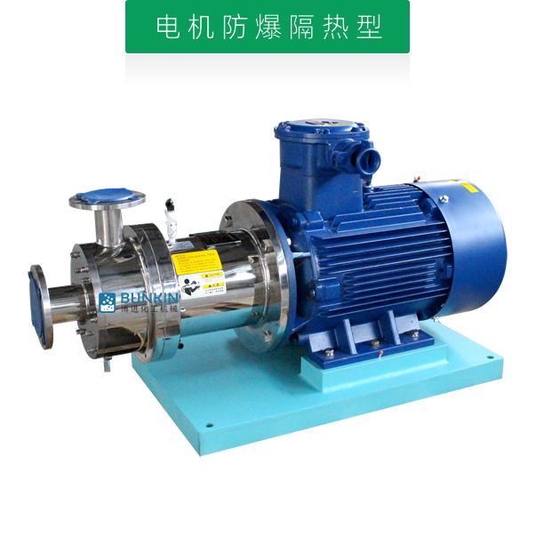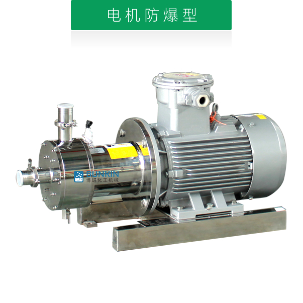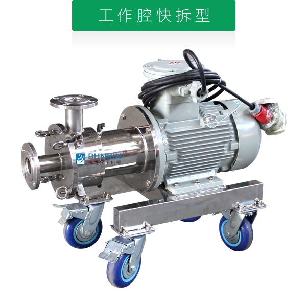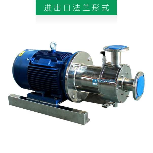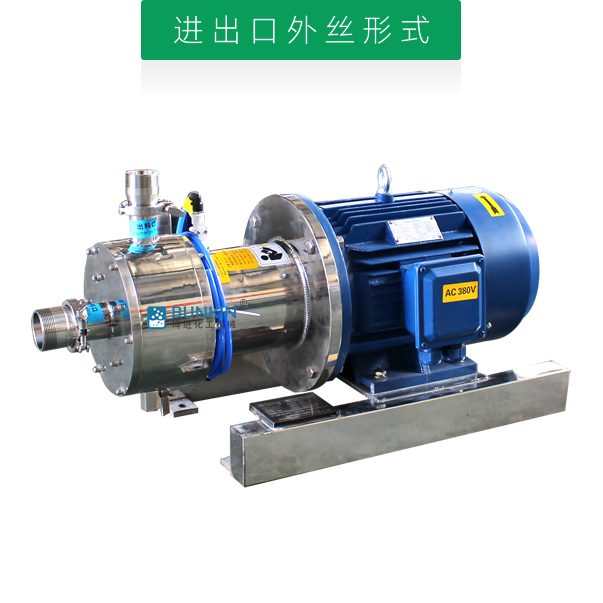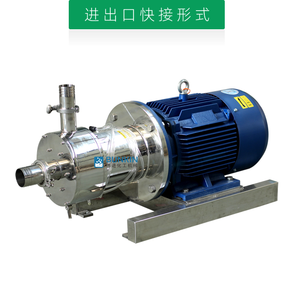 單級(jí)乳化泵采用臥式結(jié)構(gòu)。在狹長(zhǎng)的工作腔內(nèi)裝有一組轉(zhuǎn)定子,轉(zhuǎn)定子可設(shè)計(jì)成單級(jí)兩層或者單級(jí)六層結(jié)構(gòu),轉(zhuǎn)定子對(duì)偶耦合。由電機(jī)帶動(dòng)中間軸進(jìn)行高速運(yùn)轉(zhuǎn),轉(zhuǎn)定子形成真空,物料從進(jìn)口被吸入轉(zhuǎn)定子腔內(nèi),強(qiáng)大動(dòng)能使轉(zhuǎn)子產(chǎn)生極高的線速度,使物料在轉(zhuǎn)、定子間隙之間經(jīng)過(guò)強(qiáng)烈的撞擊、破碎、離心擠、液層摩擦、強(qiáng)力剪切之后飛射出去,在多種不同方向力的作用下,產(chǎn)生強(qiáng)大紊流,物料從出口流出。并可根據(jù)工藝要求進(jìn)行多次循環(huán)處理。