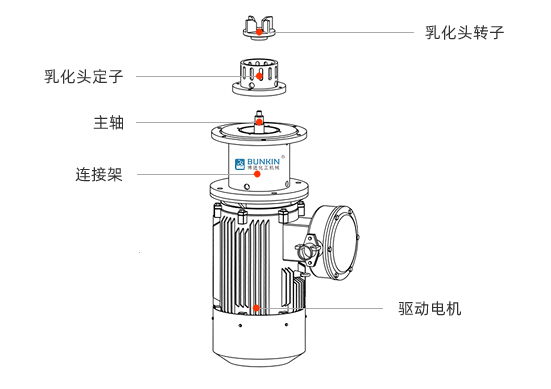 在馬達的驅(qū)動下,高速旋轉(zhuǎn)的轉(zhuǎn)子迅速將釜底的物料雙向吸入轉(zhuǎn),定子工作區(qū),在十分狹窄的間隙內(nèi)承受著劇烈機械運動和液力剪切,使物料剪切、撕裂、破碎,同時迅速與中、高層物料進行混合均質(zhì),并且更有效地配合立式乳化機完成乳化均質(zhì)、粉碎、混合反應(yīng)等工藝過程。