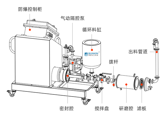 研磨腔體帶冷卻水夾套,在設(shè)備運(yùn)行時(shí)通水冷卻,起到很好的冷卻效果,常規(guī)溫升小于10º。
