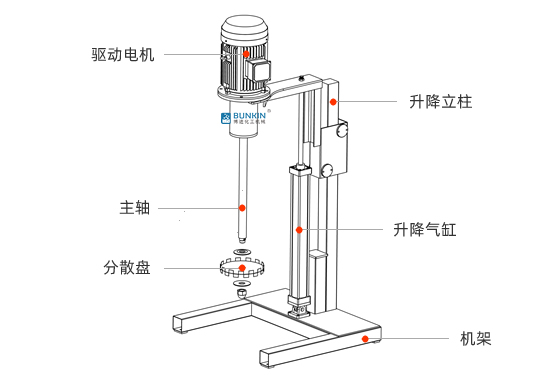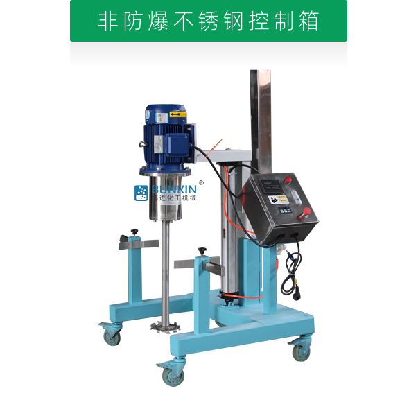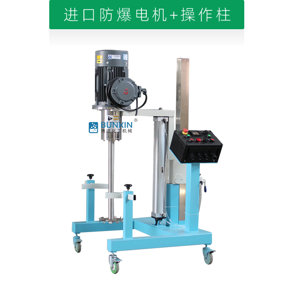 設備通過氣缸作為升降執(zhí)行器,帶氣動控制閥控制分散機上升、停止、下降,耗氣量低,操作簡單;分散盤采用內六角螺栓與主軸固定,能夠方便快速拆卸更換,清洗容易;帶有手動夾桶裝置,可以快速將攪拌桶固定,防止桶在工作中發(fā)生位移造成安全事故;