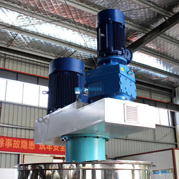 同心雙軸分散攪拌釜攪拌漿葉在動(dòng)力機(jī)組的驅(qū)動(dòng)下,沿固定方向旋轉(zhuǎn);在旋轉(zhuǎn)過程中,驅(qū)使物料做軸向旋轉(zhuǎn)和徑向旋轉(zhuǎn)。攪拌機(jī)內(nèi)的物料,同時(shí)存在軸向運(yùn)動(dòng)和圓周運(yùn)動(dòng),因而同時(shí)存在剪切攪拌和擴(kuò)散攪拌等幾種攪拌形式。在攪拌槳上裝有刮刀,緊貼桶壁刮拭,刮刀隨著攪拌器旋轉(zhuǎn)時(shí)把桶壁的物料完全刮掉,使桶壁無滯留料,同時(shí)提高混合效果。分散盤通過高速運(yùn)轉(zhuǎn),使物料呈環(huán)狀流,產(chǎn)生強(qiáng)旋渦,呈螺旋狀下降到渦流底部。粒子間產(chǎn)生強(qiáng)烈的剪切撞擊與磨擦,達(dá)到迅速分散、溶解功能。攪拌盤通過圓周運(yùn)動(dòng),產(chǎn)生較好的徑向作用里,加速物料循環(huán),提高分散效率。