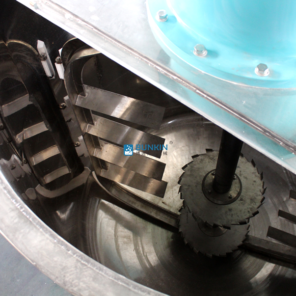 在攪拌器上裝有刮刀,緊貼釜壁刮拭,釜壁經(jīng)自動(dòng)拋光機(jī)拋光,確?;顒?dòng)刮刀在旋轉(zhuǎn)時(shí)把釜壁的物料完全刮掉,使釜壁無滯留料,提高混合效果。