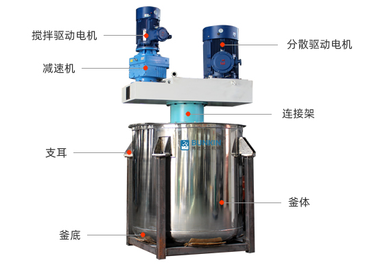 同心雙軸分散攪拌釜由帶刮壁式攪拌器和高速分散器組成,兩組攪拌器同時(shí)作業(yè)使物料受到強(qiáng)烈的分散、混合作用,達(dá)到快速混合的目的;攪拌器一般分為錨式和蝶式兩種,針對不同粘度、比重的物料和不同的生產(chǎn)工藝要求可以設(shè)計(jì)較好攪拌形式。