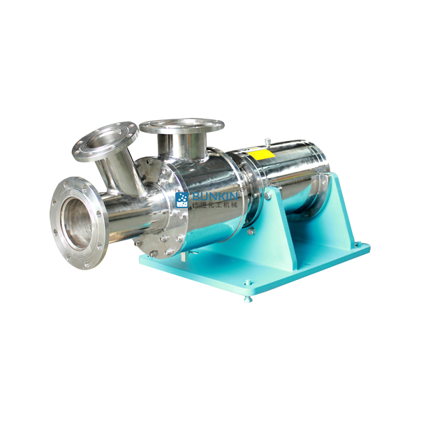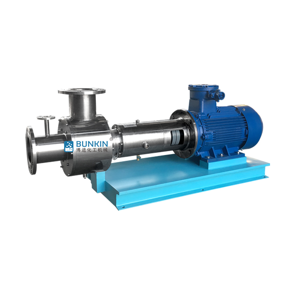 固液混合乳化泵是通過主軸的吸料裝置在狹窄的過道內(nèi)進行高速運動,而產(chǎn)生的真空將比重略輕的固體物料吸入乳化泵工作腔與液體進行混合均質(zhì)輸送。一般連接于反應釜(罐)的出口處,當液體自流于乳化泵時與吸入的固體物料進行高速混合均質(zhì),使固體物料快速得到混合、反應、解聚、溶解、均質(zhì)等工藝流程。