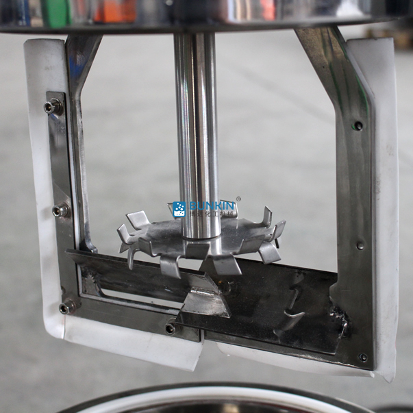 在攪拌器上裝有刮刀,緊貼桶壁刮拭,桶壁經(jīng)立車精加工后,再經(jīng)自動拋光機拋光,確保活動刮刀在旋轉(zhuǎn)時把桶壁的物料完全刮掉,使桶壁無滯留料,提高混合效果。