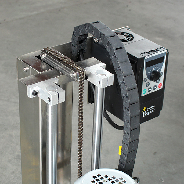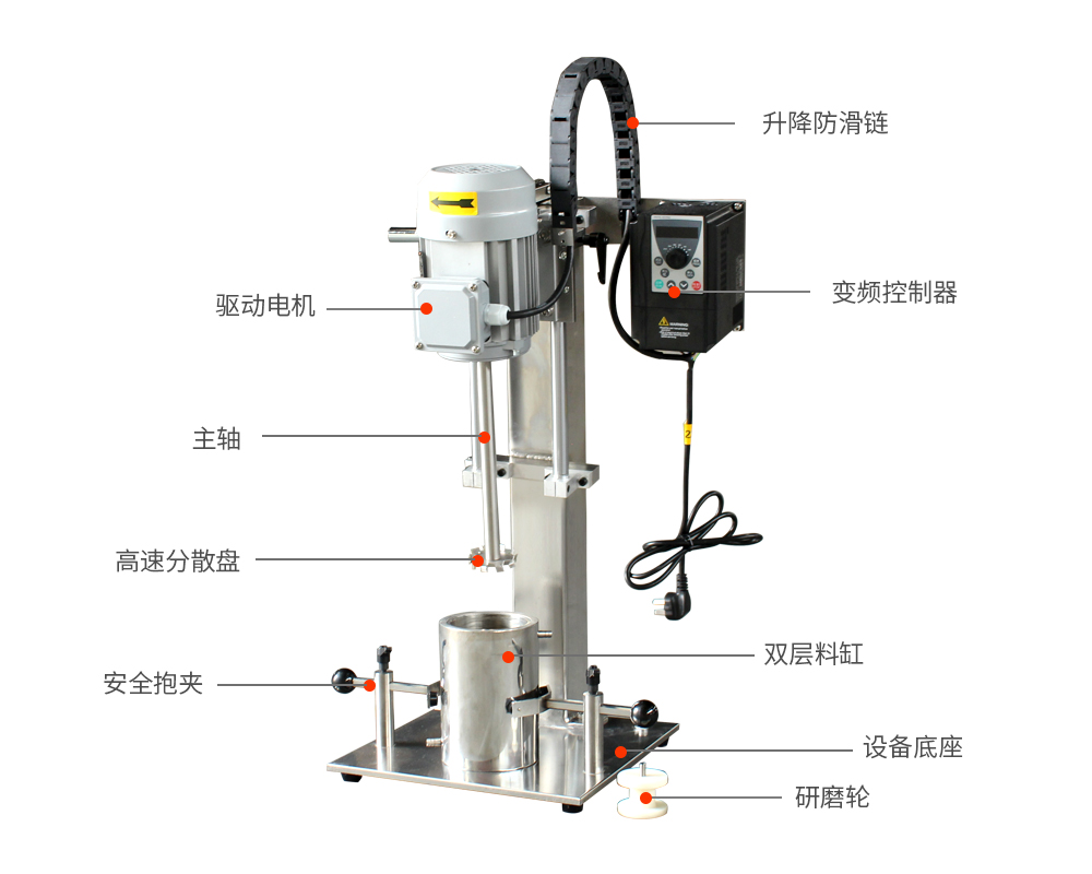 設(shè)備帶有鎖緊及升降手柄,能夠快速升降和固定;分散盤采用內(nèi)六角螺栓與主軸固定,能夠方便快速拆卸更換,清洗容易;帶有夾桶裝置,可以快速將攪拌桶固定,防止桶在工作中發(fā)生位移造成安全事故。